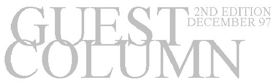 This month our Guest Columnist is the contemporary composer John Tavener, who has recently reached a wider audience with the playing of a piece of his at the funeral service for Princess Diana. We also have articles on, inter alia, being a crew member in the Whitbread Round the World Yacht Race; pieces on identity: being "Irish"; being a member of two different minority groups ie Gay and Disabled; the death of one's parents; childbirth; a day in the life of a violinist. There is a motley selection as usual of "No Can Do" correspondence. I have refrained from publishing my fan mail.