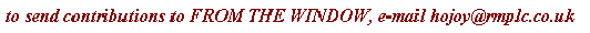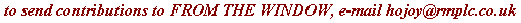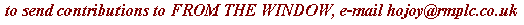 here in Ian's shed in sarf London. Well what can I say ? FROM THE WINDOW is a triumph. You have created a mag which veers from thing to thing with great ease and excitment. It sits on the web but is just as happy on paper (no java nonsence bouncing about) I am touched that Ian has sent you something - is great.