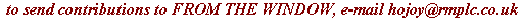 I am desireous of this magazine becoming less lamentably ethnocentric and reflecting a broader range of lifestyles, backgrounds and experiences. Therefore I am currently seeking contributions for the next edition from sources across the globe and very much hope that surfers reading this now as a result of my letter-writing or as a result of fortuitous roaming will wish to add their own voices to "FROM THE WINDOW".