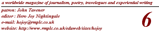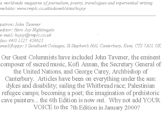 Since returning from my journey around the world earlier this year, I have been much preoccupied in digesting my experiences, which I recount briefly in my Editor's View. Despite quite considerable media interest in me, or perhaps because of it, I have been totally unable to hook any eminent person as Guest Columnist for this edition, despite sending out nearly 70 letters, each personalised and not just looking like a circular. This edition has been delayed time and time again by hopes raised, but now I can delay no further and am going ahead with mag 6. All the contributors appear in a annotated list below with hyperlinks. I would like to be able to assure you that future editions will return to the previous format but this obviously depends upon the goodwill of famous and busy people.
